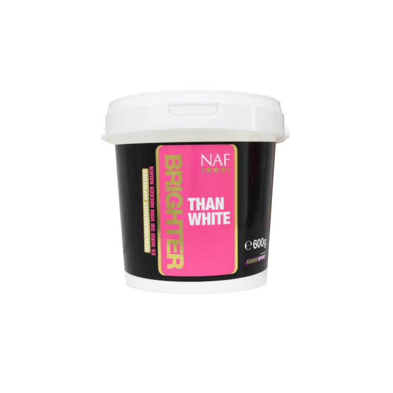 Brighter than White ist ein weißes Pulver, das trocken oder als feuchte Paste aufgetragen werden kann. Damit verleihen Sie der gewünschten Fellpartie einen perfekten, letzten Schliff. Als Paste angewendet, können Sie diese einbandagieren und über Nacht eintrocknen lassen, ohne dass die Bandagen dabei verschmutzt werden. Als trockene Anwendung tragen Sie das Pulver mit einer Bürste auf und massieren es in Fell, Mähne oder Schweif ein. So erhalten Sie ein perfektes, weißes Finish.