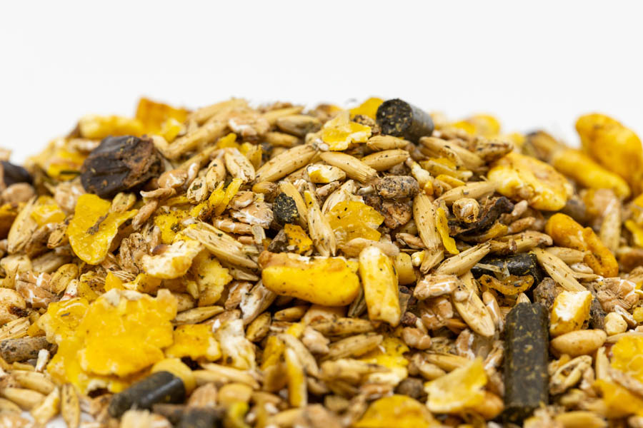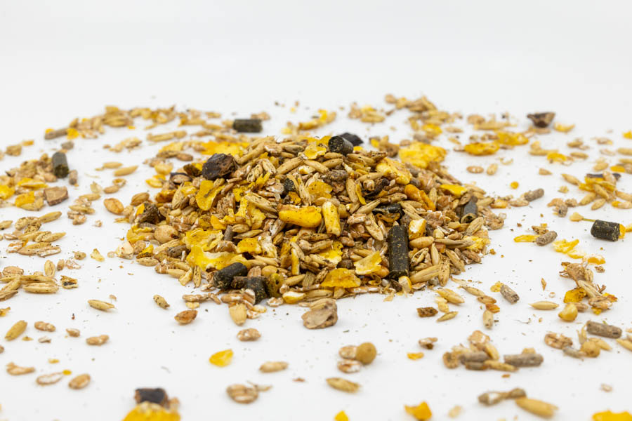 Hafer, Gerste, Weizen flockiert, Rübentrockenschnitzel, Mais flockiert, Johannisbrotschalen, Mais, Sojabohnen (getoastet), Mais gepoppt, Sesamexpeller, Rübenmelasse, Luzernegrünmehl, Gerste gepoppt, Calciumcarbonat,Sojaextraktionsschrotfutter aus geschälter Saat (dampferhitzt), Weizen, Sonnenblumenextraktionsschrot, Monocalziumphosphat,Weizenkleie, Natriumchlorid, Sojaöl, Magnesiumoxyd