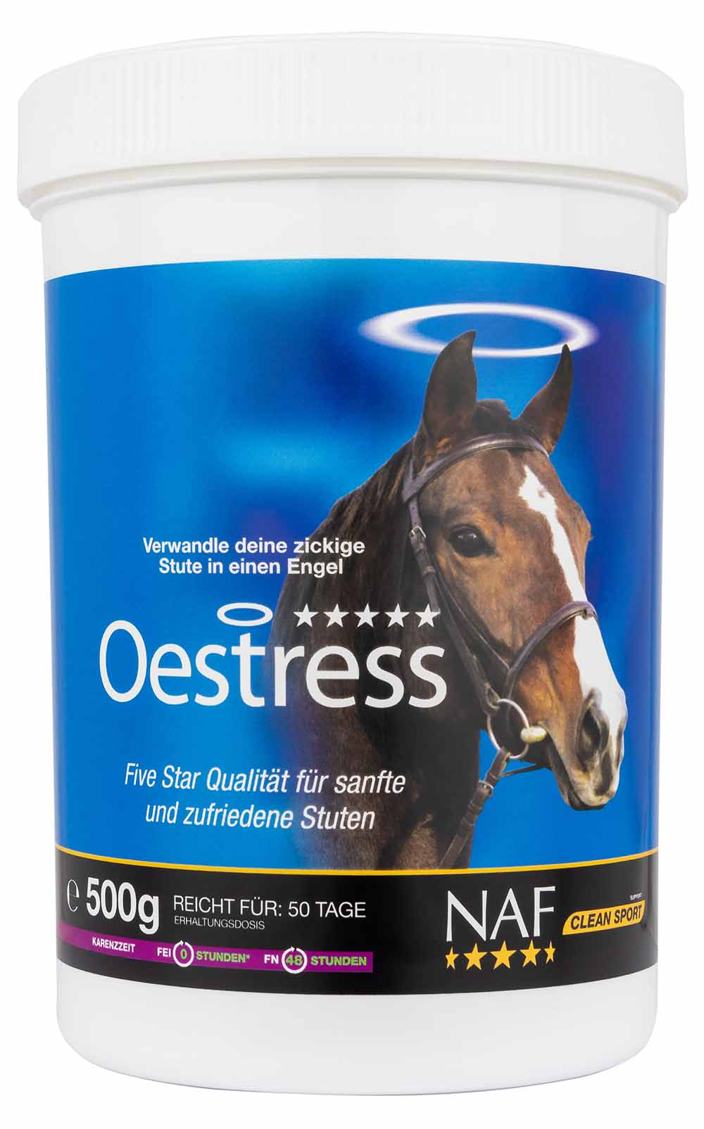 Stuten sind durch hormonelles Ungleichgewicht oft genauso gestresst wie Hengste. Anzeichen dafür können Stimmungsschwankungen, Aggressivität, Empfindlichkeit sowie eine eingeschränkte Konzentrations- und Leistungsfähigkeit sein. Die anatomische Lage der Eierstöcke, nämlich direkt hinter dem Sattel, kann dazu führen, dass die Stute nicht über den Rücken gehen will, mit dem Schweif schlägt oder sogar bockt und tritt. Oestress enthält einen einzigartigen Komplex aus Kräutern, die seit hunderten von Jahren für ihre unterstützende Wirkung auf den Hormonhaushalt bekannt sind. Durch die Fütterung von Oestress helfen Sie Ihrem Pferd den Hormonhaushalt natürlich ins Gleichgewicht zu bringen, sich zu entspannen und sich auf die Arbeit zu konzentrieren. Oestress sollte vor allem im Frühling und Sommer – oder aber auch ganzjährig – gefüttert werden und kann entsprechend dem Zyklus der Stute angepasst werden.